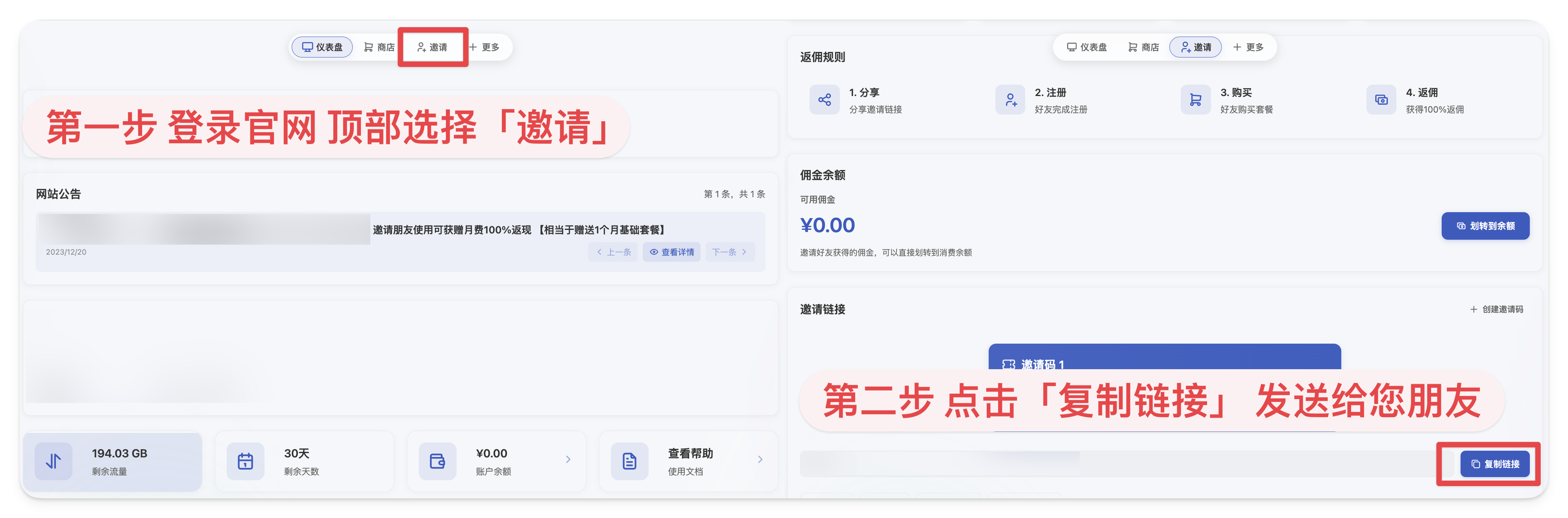 文章分类: FAQ 常见问题 请您认真阅读以下教程并按步骤操作 感谢您对本站对支持 现在您通过发送邀请链接给您的朋友 邀请朋友下单一次月付套餐可「获得100%返利」 >>>「点此处查看如何拉新」<<< 通过本教程「首次激活」或「续费」以后 建议进入电报群,便于后续续订和售后 >>>「点此加入电报售后群」<<< 如何邀请朋友? 步骤: 只需要2步,您就可以获得一个月奖励! 把链接发送给您的朋友注册购买后,即可邀请成功! 更新于: 30/05/2024