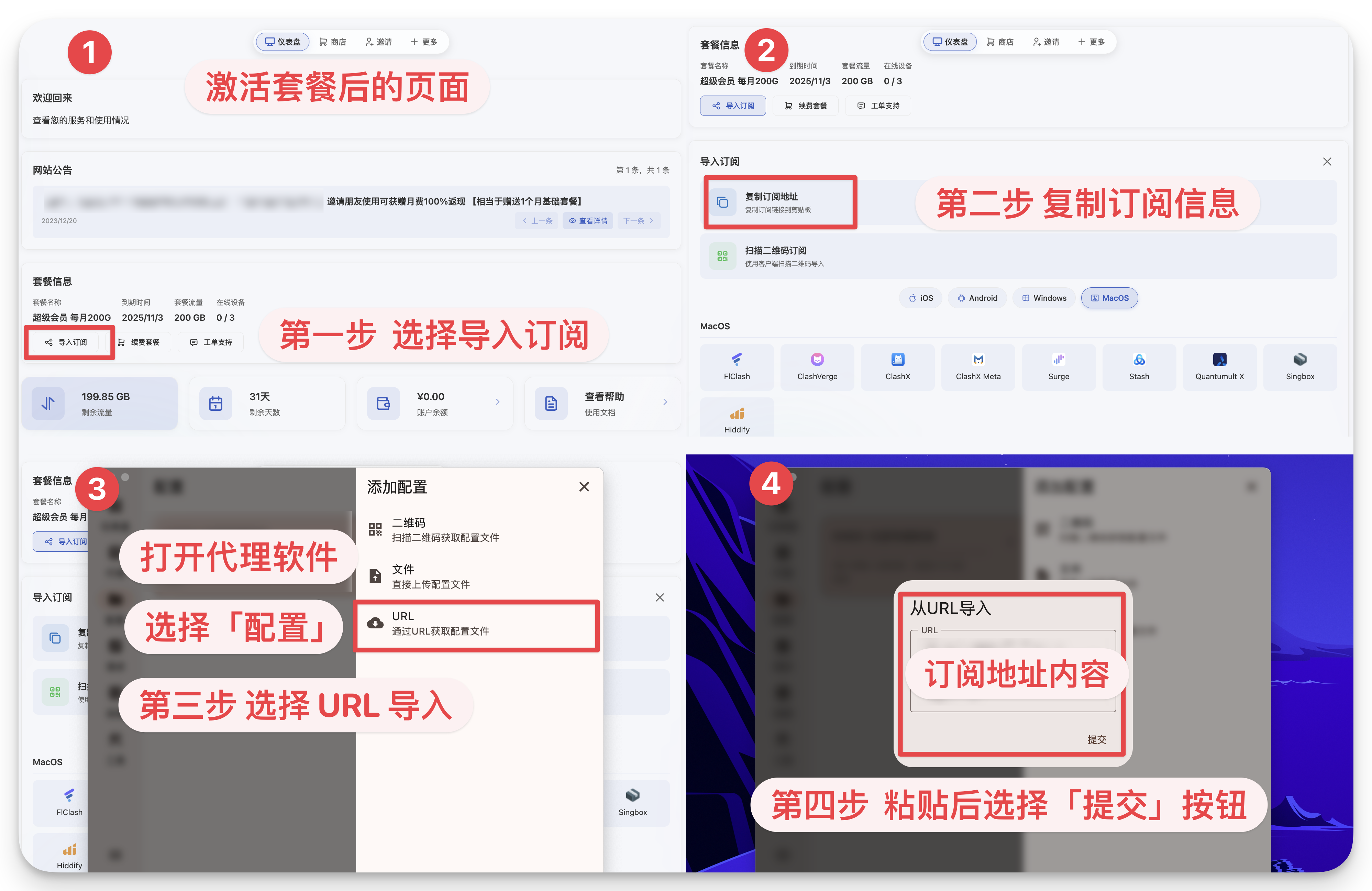 软件使用: ⚠️ 如您按照下图所展示步骤中,在第4步,点击提交按钮后无法正常导入订阅内容 请进行订阅转换后再次尝试导入订阅 「前往订阅转换」